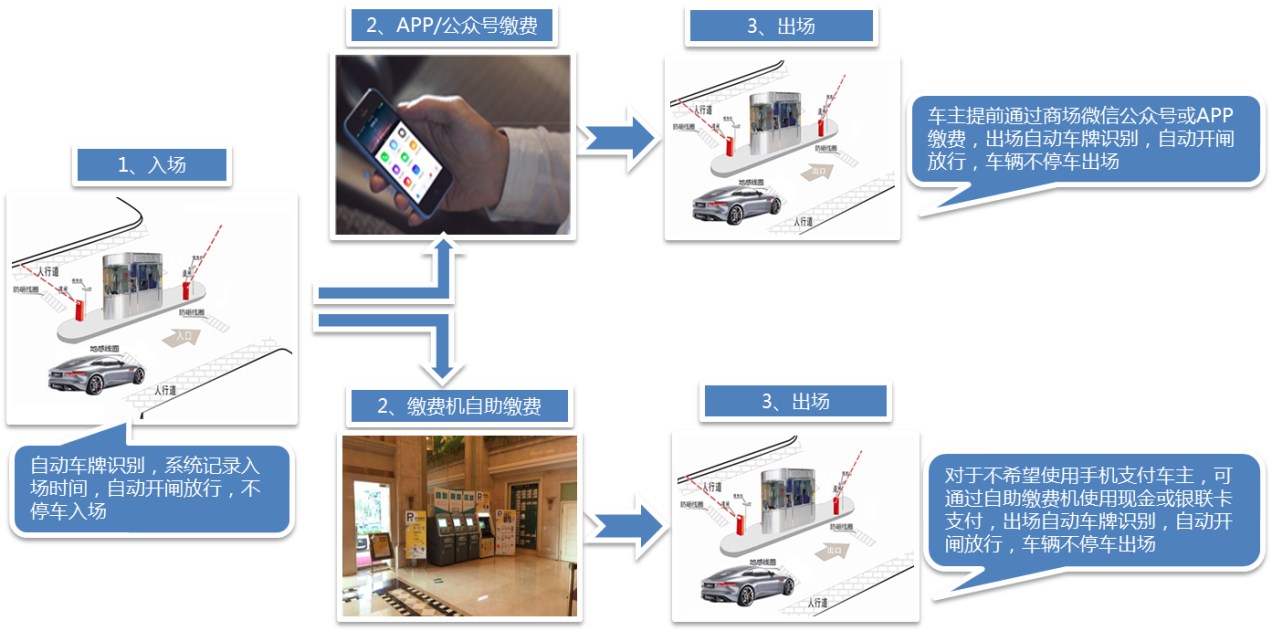 臨時(shí)車輛車牌識別不停車進(jìn)場,手機(jī)/自助繳費(fèi)機(jī)自助繳費(fèi)后不停車出場,給臨時(shí)車輛帶來極佳的停車體驗(yàn)。