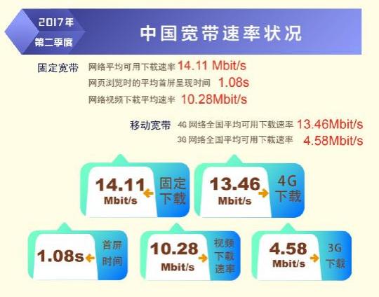 日前,寬帶發(fā)展聯(lián)盟發(fā)布了第 16 期《中國寬帶速率狀況報告》(2017 年第二季度)。報告顯示 2017 年第二季度我國固定寬帶網(wǎng)絡(luò)平均下載速率達到 14.11Mbit/s,比 2017 年第一季度提高了1.1Mbit/s,同比去年第一季度提升了 34.8%。自 2015 網(wǎng)絡(luò)“提速降費”工作開展以來,我國固定寬帶可用下載速率連續(xù) 10 個季度持續(xù)提升,總提升幅度達到 3.3 倍。同時,我國移動寬帶用戶使用 4G 網(wǎng)絡(luò)訪問互聯(lián)網(wǎng)時的平均下載速率達到 13.46Mbit/s,環(huán)比 2017 年第一季度也有 14.2%的提升。