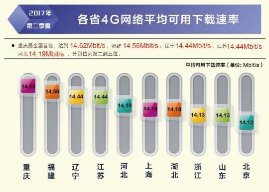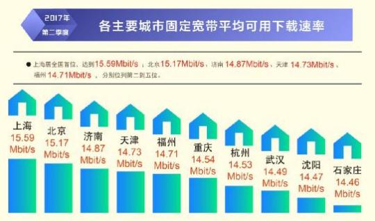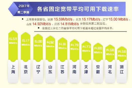 根據(jù)本次報告,除西藏自治區(qū)外,全國其他所有省級行政區(qū)域固定寬帶平均下載速率均超過 12Mbit/s,上海、北京、遼寧率先超過或達到了 15Mbit/s,位列全國前三,山東、江蘇緊隨其后。在直轄市和省會城市固定寬帶下載速率排行榜上,上海、北京、濟南、天津、福州位居前五位。從移動寬帶網(wǎng)速狀況看,重慶、福建、遼寧、江蘇、河北的 4G 網(wǎng)絡(luò)用戶下載速率排在全國省級行政區(qū)前五位;不同電信運營企業(yè)中,中國聯(lián)通的 3G 網(wǎng)絡(luò)用戶下載速率和 4G 網(wǎng)絡(luò)用戶下載速率均最高,分別達到 5.20 Mbit/s 和 15.05 Mbit/s。